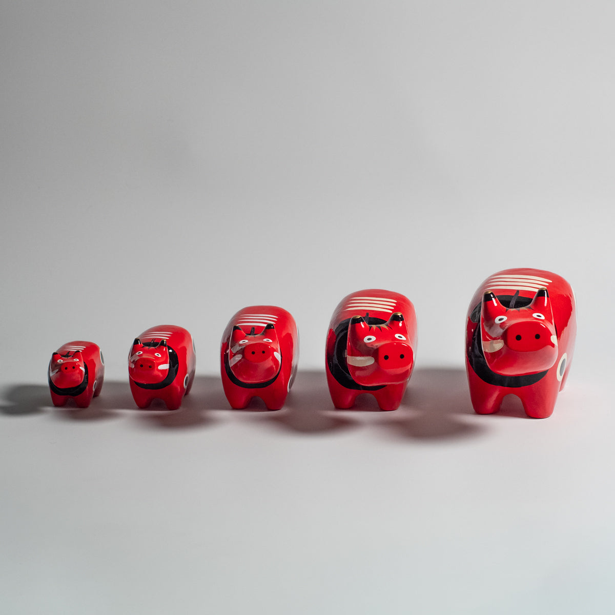 From Aizu in Fukushima Prefecture, in the northeastern Tōhoku region of Japan, its name translates as ‘red cow’ in the local dialect (aka is ‘red’ and beko is ‘cow’). Akabeko is not only a toy or an ornament, but a talisman of good fortune and health, as well as a symbol of the Aizu region. The lacquered toy is made out of two pieces – the body and the bobbing head and neck.